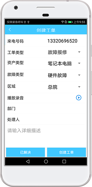 提供傳統(tǒng)電話值班臺(tái)和手機(jī)值班臺(tái)報(bào)修方式,獨(dú)創(chuàng)的手機(jī)值班臺(tái)讓你隨時(shí)隨地創(chuàng)建工單,輕松解決故障。